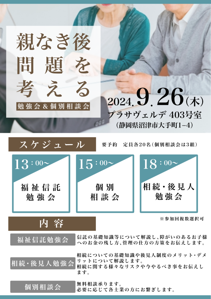 【セミナーのご案内】「親なき後」問題を考える 勉強会&個別相談会(終了いたしました。)