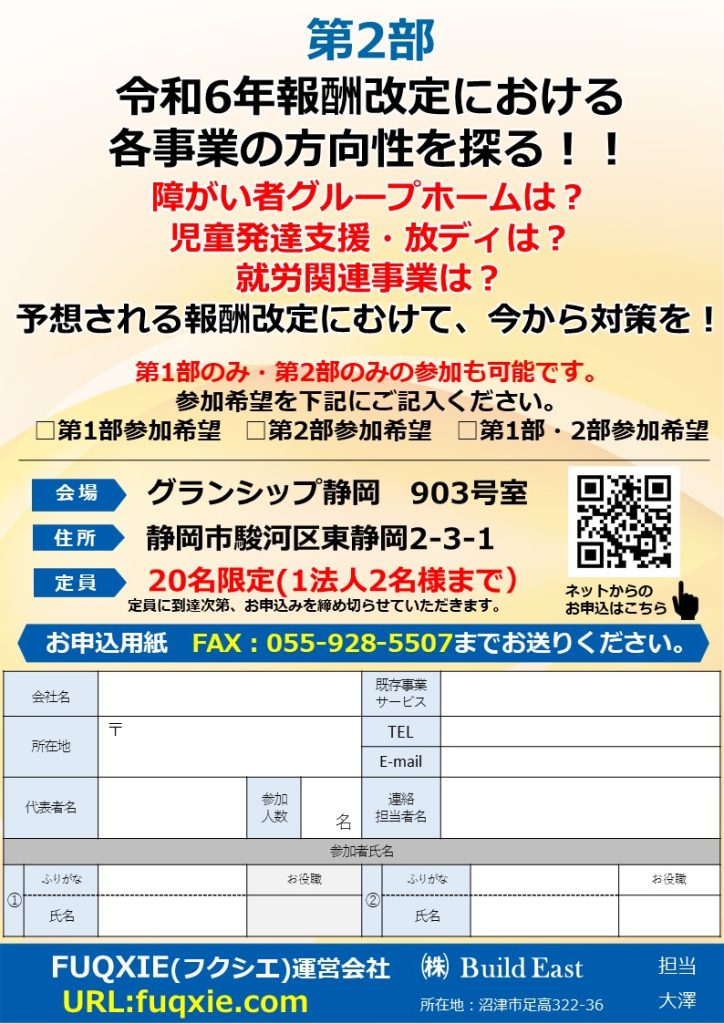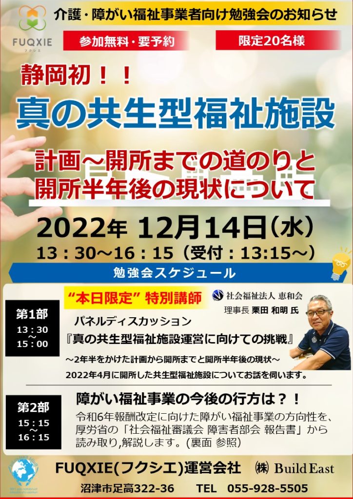【フクシエセミナー】静岡初!! ~真の共生型福祉施設 計画~開所までの道のりと開所半年後の現状について~勉強会のご案内(終了いたしました。)