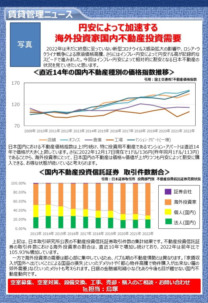 【土地活用通信 令和5年2月号】円安によって加速する海外投資家国内不動産投資需要