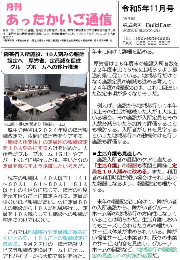 2023年11月28日 / 最終更新日 : 2023年11月28日 管理者フクシエ お知らせ 【月刊あったかいご通信 令和5年11月号】障害者入所施設、10人刻みの報酬設定へ 厚労省、定員減を促進グループホームへの移行推進