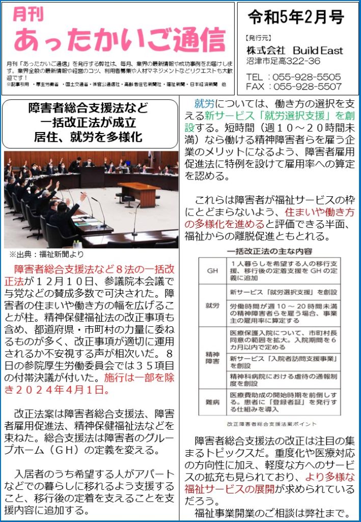 【月刊あったかいご通信 令和5年2月号】障害者総合支援法など一括改正法が成立 居住、就労を多様化