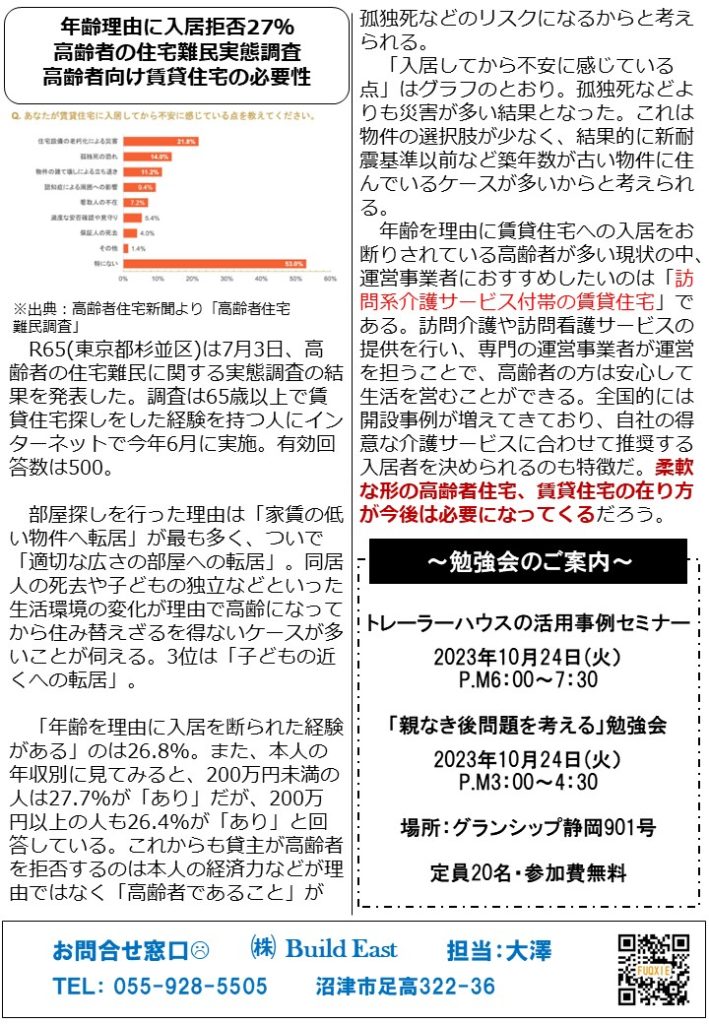 2023年9月16日 / 最終更新日 : 2023年9月15日 管理者フクシエ お知らせ 【月刊あったかいご通信 令和5年9月号】2023年10月24日(火)セミナーの詳細です。【セミナーのご案内】解決の一歩へ。親なき後問題を考えるセミナー10月(終了いたしました。)参加申込はこちら【セミナーのお知らせ】トレーラーハウスの活用事例セミナー参加申込はこちら