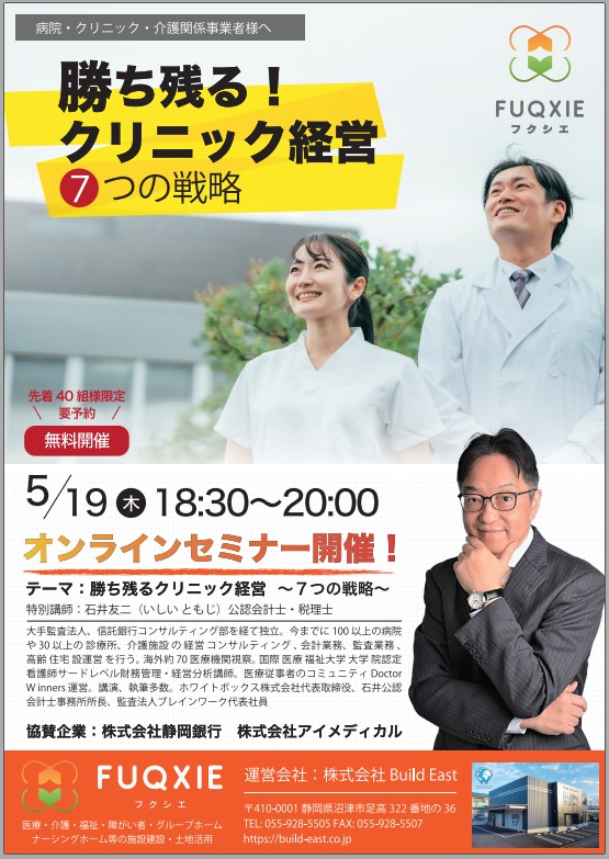 特別講師:石井友二公認会計士 オンラインセミナー開催のご案内 『勝ち残るクリニック経営〜7つの戦略〜』(終了いたしました。)