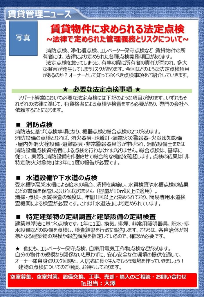 2022年4月15日 / 最終更新日 : 2022年11月9日 管理者フクシエ 求む!土地オーナー様へ 【土地活用通信】 令和4年4月号 賃貸物件に求められる法定点検福祉のことはフクシエ運営会社 株式会社BuildEast医療・介護・福祉・障がい者・グループホーム・ナーシングホーム等の施設建設・土地活用