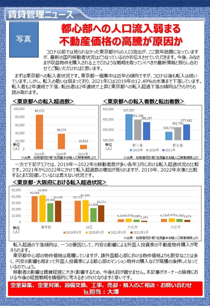 【土地活用通信】 令和4年8月号 ~都心部への人口流入弱まる 不動産価格の好調が原因か~