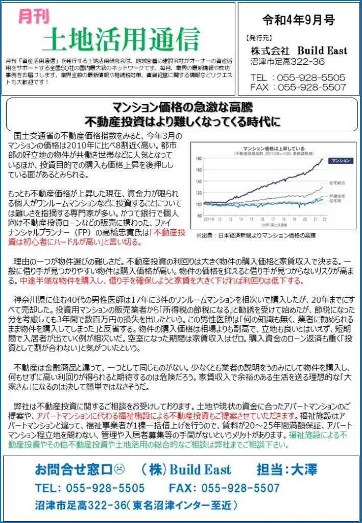 【土地活用通信 令和4年9月号】 ~マンション価格の急激な高騰 不動産投資はより難しくなってくる時代に~