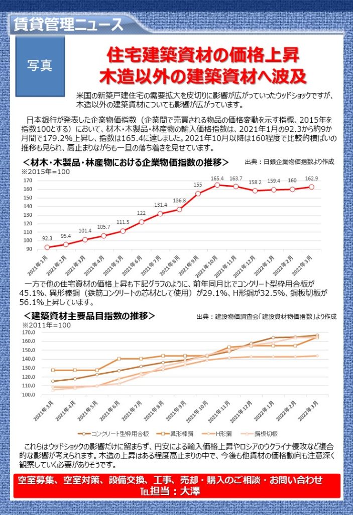 2022年6月20日 / 最終更新日 : 2022年11月9日 管理者フクシエ 求む!土地オーナー様へ 【土地活用通信】 令和4年6月号 住宅建築資材の価格上昇 木造以外の建築資材へ波及福祉のことはフクシエ運営会社 株式会社BuildEast医療・介護・福祉・障がい者・グループホームナーシングホーム等の施設建設・土地活用