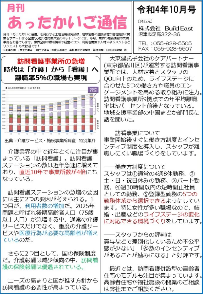 2022年10月15日 / 最終更新日 : 2022年11月9日 管理者フクシエ お知らせ 【月刊あったかいご通信 令和4年10月号】 ~訪問看護事業所の急増 時代は「介護」から「看護」へ 離職率5%の職場も実現~
