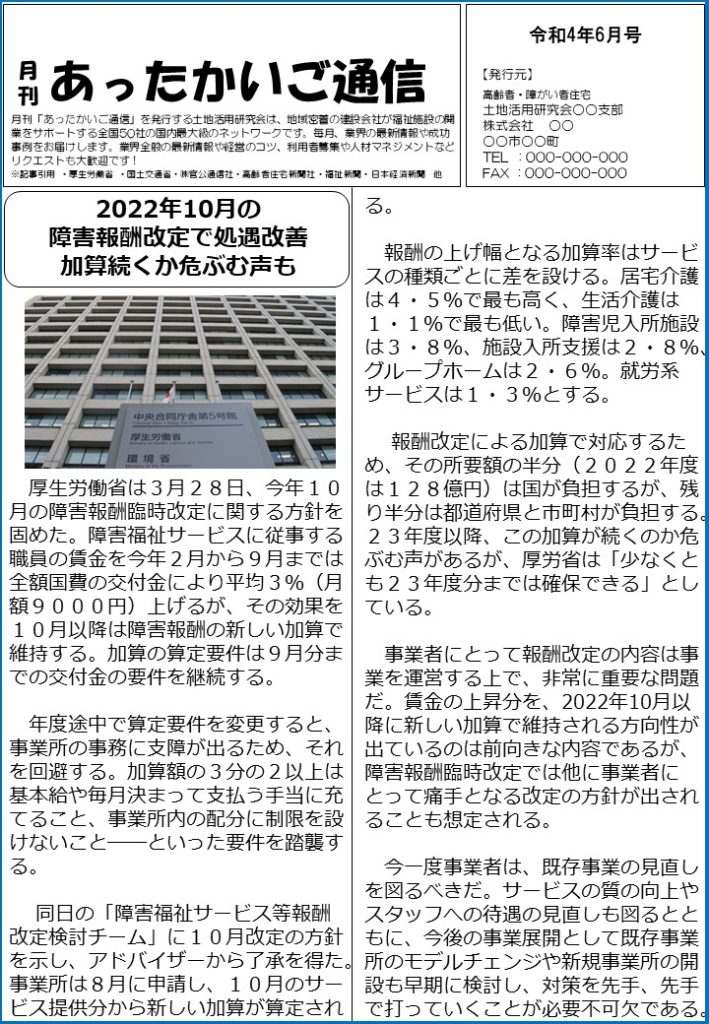 2022年6月21日 / 最終更新日 : 2022年11月9日 管理者フクシエ お知らせ 【月刊 あったかいご通信】 令和4年6月号 2022年10月の障害報酬改定で処遇改善 加算続くか危ぶむ声もここをクリックビルドイーストちゃんねる