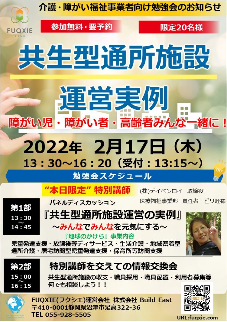 今回の勉強会では、共生型通所施設運営の実例について直接お話を聞くことができるので、事業所の雰囲気やサービスの活動、事業の取り組みについても貴重な情報を皆さまが交換できる素敵な時間を提供できればと思います。