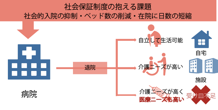 病床数の減少により、医療+介護サービスを必要とする高齢者や難病患者さんの「受け皿」が不足しています。医療+介護サービスを提供できる施設「ナーシングホーム」は、これからの社会に必要な社会資源です。