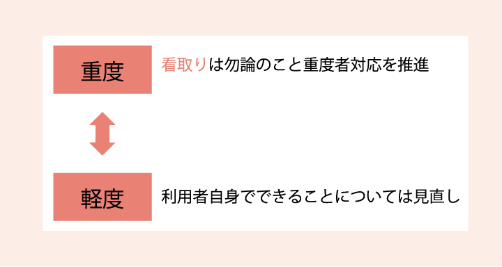 3年毎行われる介護保険報酬改定において、重度者への対応強化が求められています。看取り対応も必須と言えます。一方、軽度の方は介護サービスの必要性は認めるものの、できる事は高齢者自身で行ってもらうという方向性になっています。