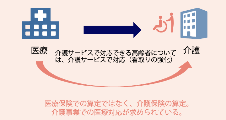 看取りの対応など医療との連携が必要不可欠であるとの方針を、国は強化しています。病院から介護事業所へ、という流れが確立されていく中で、介護事業所における医療依存度の高い高齢者への対応が求められています。
