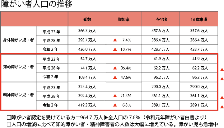 国内の障がい者人口は右図のように年々増加しており、令和2年419,3万人と、平成23年に比べて95,9万人増加しています。これは全人口の7,6%を占めており、人口の増減に比べて知的障がい者、精神障害者の人数は大幅に増えている状況です。
