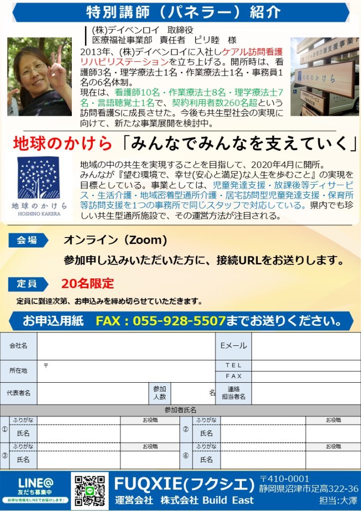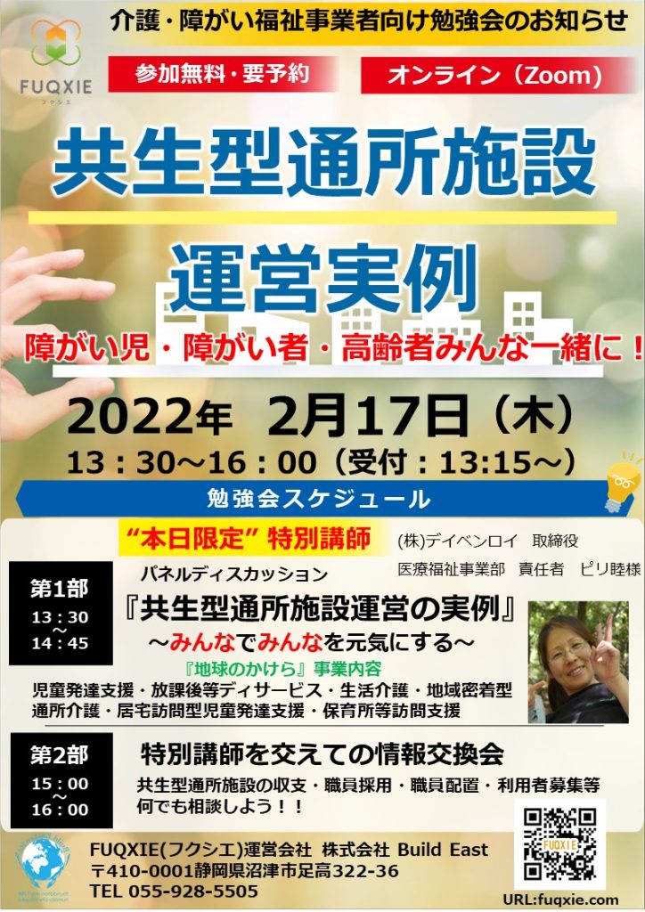 この度、医療・介護・障がい福祉の事業者様に向け「共生型通所施設運営実例」と題しまして、勉強会&情報交換会を開催致します。 沼津市の「地球(ほし)のかけら」様では、児童発達支援・放課後等ディサービス・生活介護・地域密着型通所介護・居宅訪問型児童発達支援・保育園等訪問支援の事業を同じスペース・同じスタッフで対応されています。今回、運営されている(株)デイベンロイ・医療福祉事業部のピリ 睦様にご協力いただき、パネルディスカッション形式による講演と情報交換会を企画しました。リアル対面形式で予定しておりましたが、オンライン形式に変更して開催いたします。是非ご参加ください